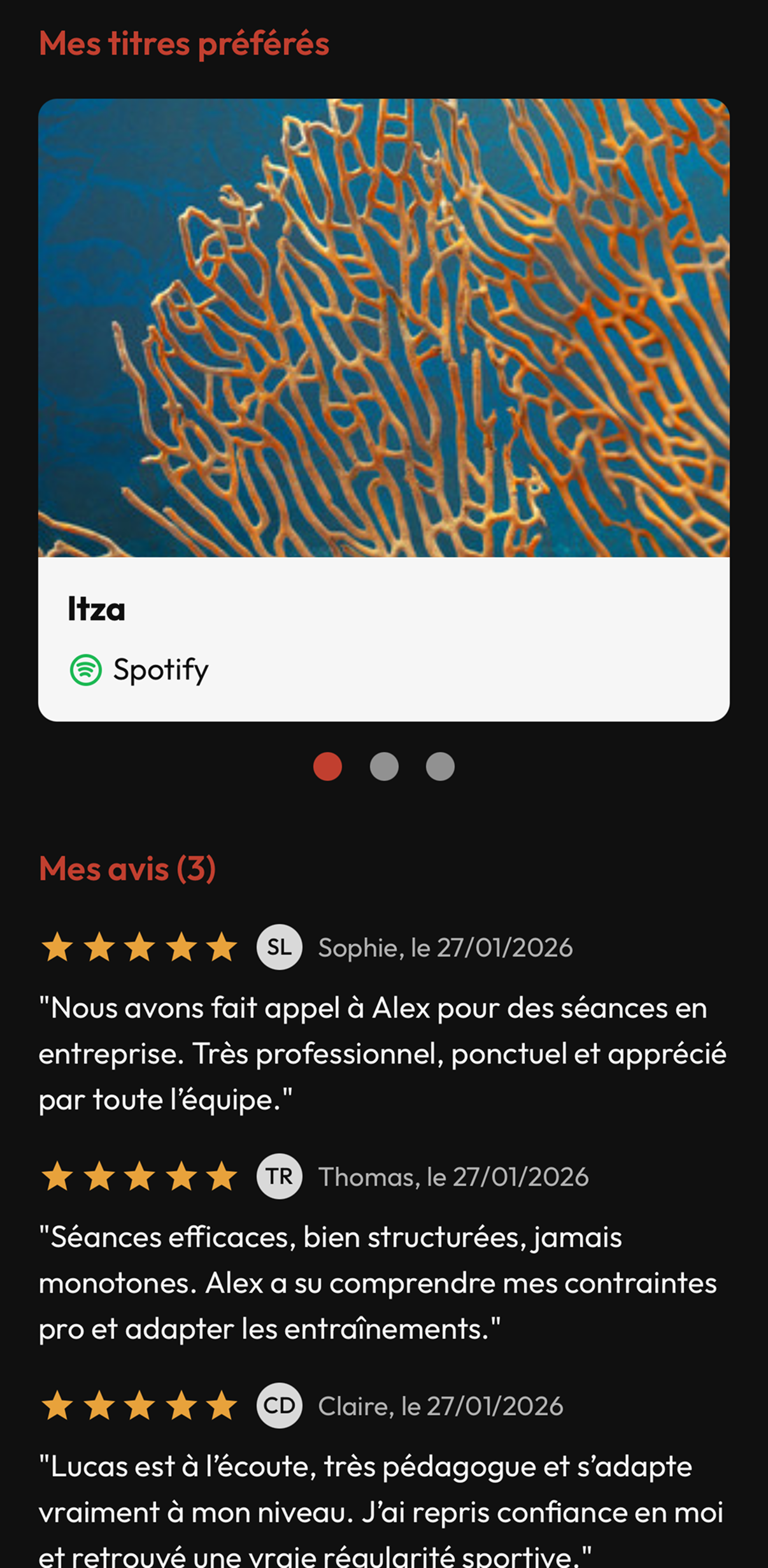 Tes domaines de spécialisation et les profils que tu accompagnes sont présentés de façon lisible pour aider chacun à se projeter.